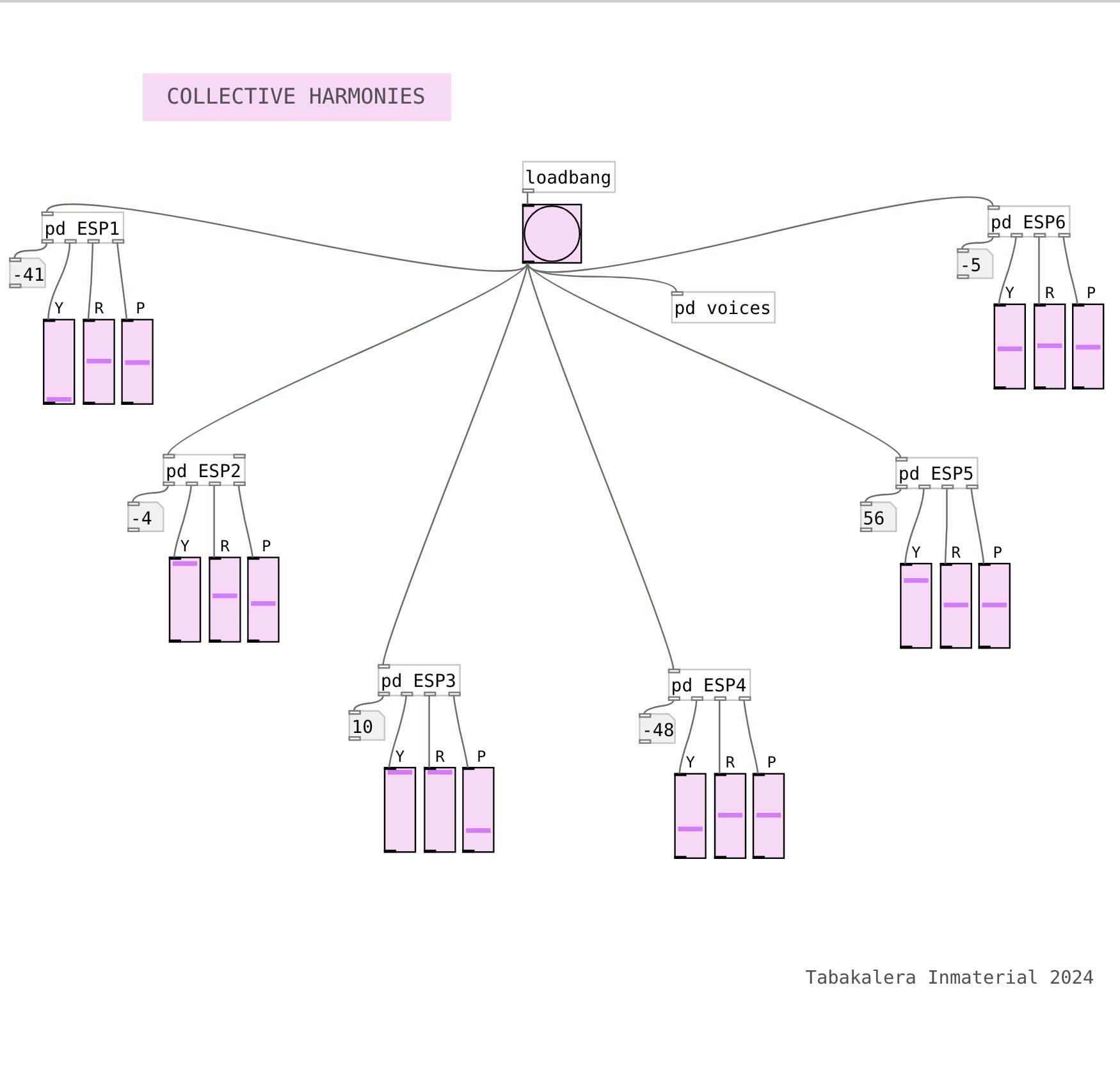 Collective Harmonies se enfoca en generar una experiencia sonora colectiva a través del tacto. Utiliza la tecnología interactiva como medio de comunicación entre el humano y la máquina y reconoce su capacidad para generar experiencias. Partiendo de este supuesto filosófico, este proyecto cuestiona la relación entre entidades humanas y no humanas, así como el límite de los cuerpos y el espacio en actuaciones participativas